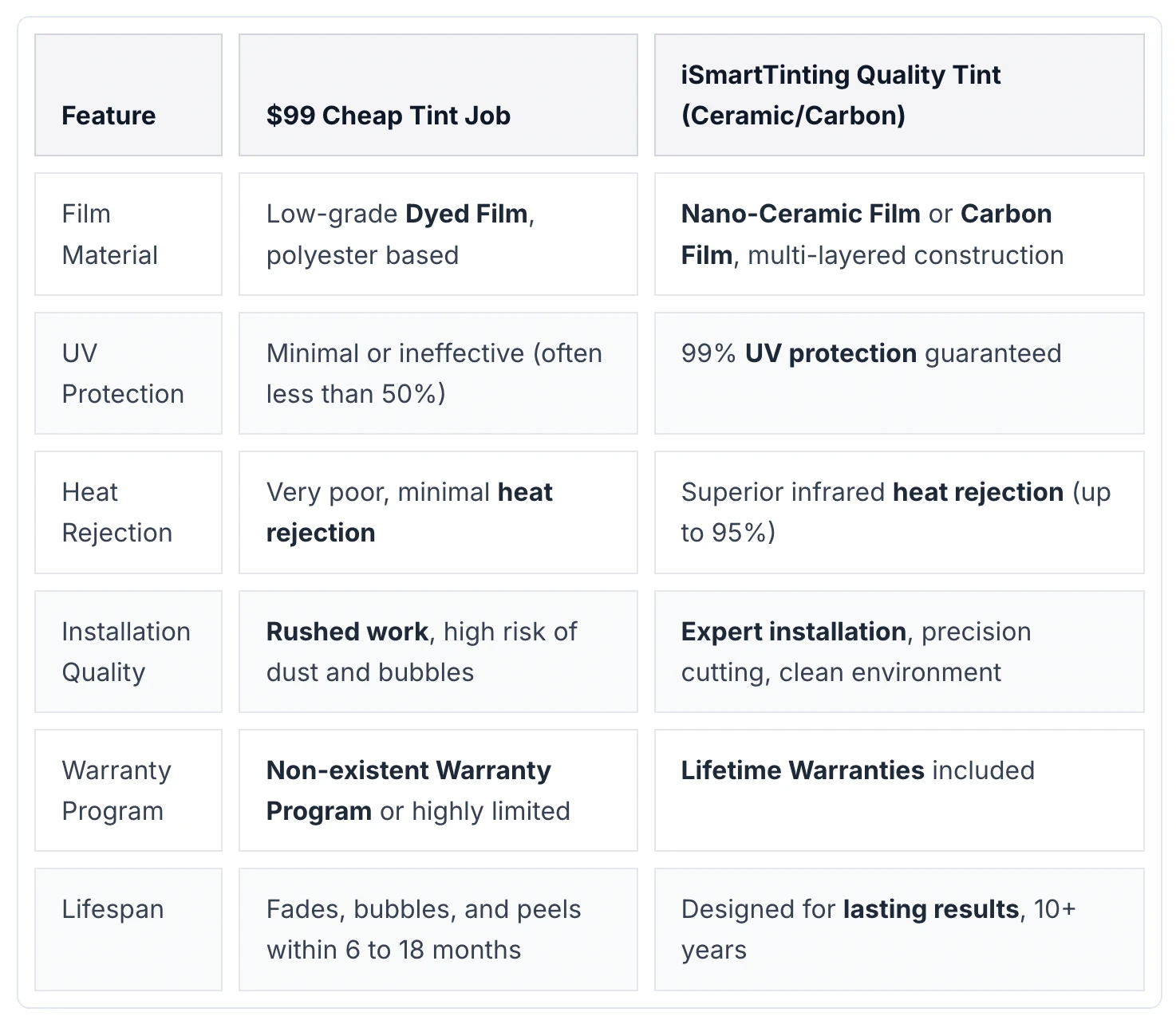 Choosing a $99 tint job is never a short-term saving; it is a guaranteed path to future expense and frustration. When you contrast a budget special with the professional installation and premium films offered by iSmartTinting, you are choosing between temporary inconvenience and a durable, long-term vehicle enhancement. The following comparison highlights the critical differences in window tinting installation quality and advanced film materials, demonstrating why quality vehicle tinting is an essential investment.
